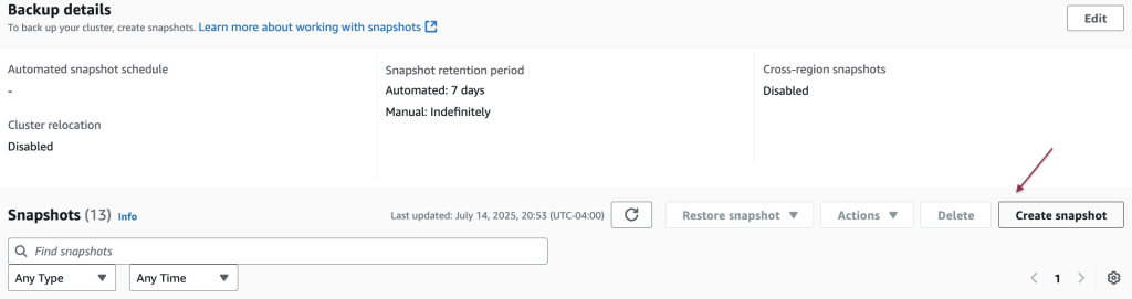 - スナップショットが存在することを確認します: aws redshift describe-cluster-snapshots --snapshot-identifier <your-snapshot-name>