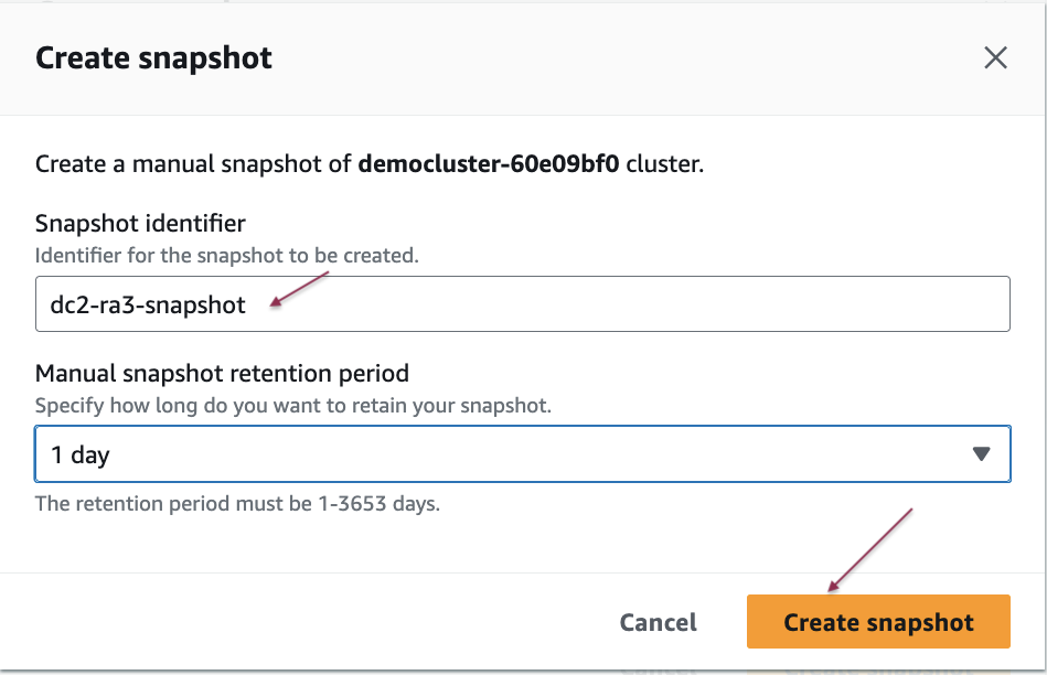 - スナップショット識別子を入力し、スナップショット保持期間を選択してから、[スナップショットを作成] を選択します。