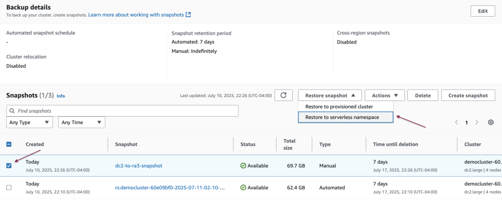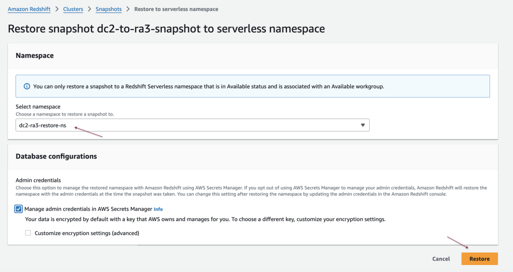 - スナップショットを Amazon Redshift Serverless 名前空間に復元します: aws redshift-serverless restore-from-snapshot --snapshot-arn "arn:aws:redshift:<your-region>:<your-account-number>:snapshot:<source-cluster-id>/<your-snapshot-name>" --namespace-name <your-serverless-namespace> --workgroup-name <your-serverless-workgroup> --region <your-region>