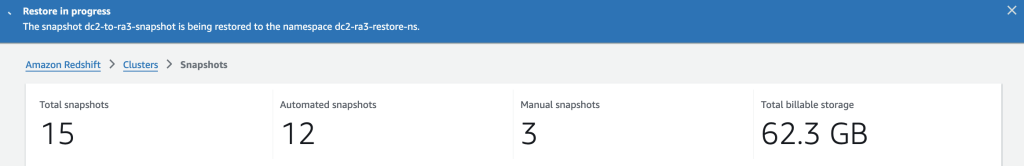 - ソースクラスターからスナップショットを作成します: aws redshift create-cluster-snapshot --cluster-identifier <your-dc2-cluster-id> --snapshot-identifier <your-snapshot-name>