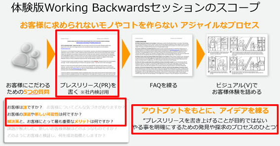 今回実施した「体験版Working Backwardsセッション」は、お客様を中心とした創造的課題解決アプローチのエッセンスを簡易に体験いただくワークショップです。個人ワークを中心とした約2.5時間のマイクロ版と、個人ワーク・グループワークの両方を行う約4時間のミニ版セッションがありますが、今回は前述の顧客中心の発想を組織に根付かせたいという課題に取り組むため、グループワークを含むミニ版をご選択いただきました。