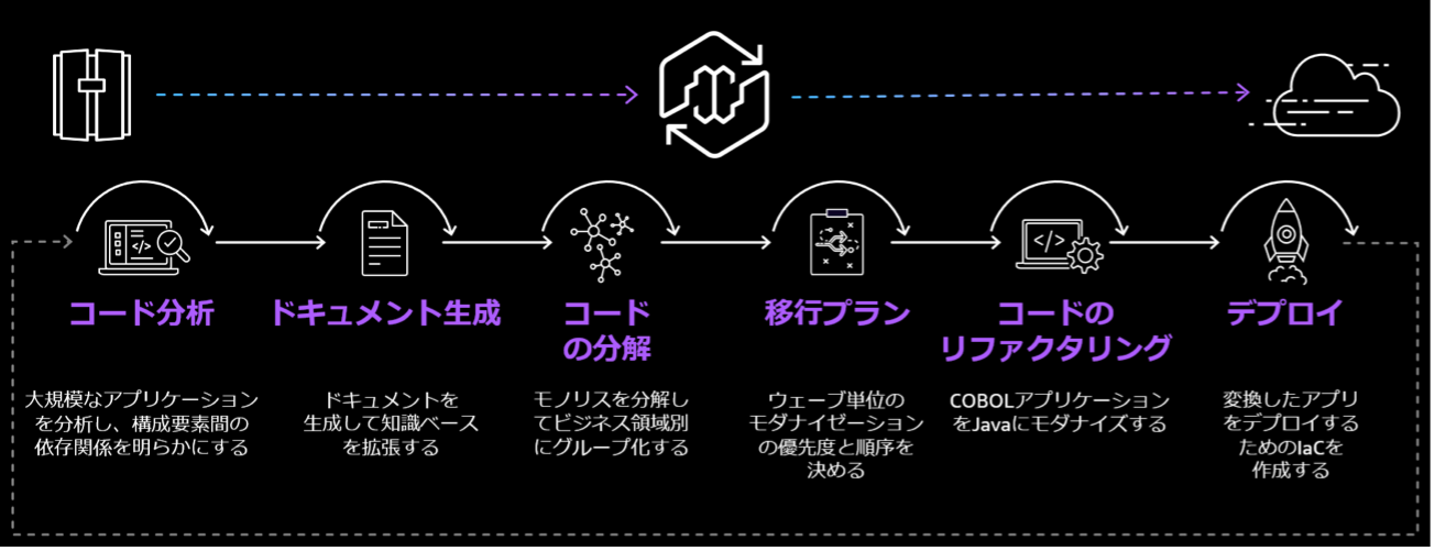 AWS Transform for mainframe は、メインフレームのワークロードを大規模にモダナイズするためのエージェント型 AI サービスです。メインフレームのコードベースの分析、ドキュメントの生成、ビジネスロジックの抽出、モノリシック構造の分解、移行プランの作成、レガシーコードの変換、コードの品質を向上させるための Reforge、コードデプロイといった工程の自動化を行います。利用者は、目標に応じて必要な機能を選択し利用することができます。