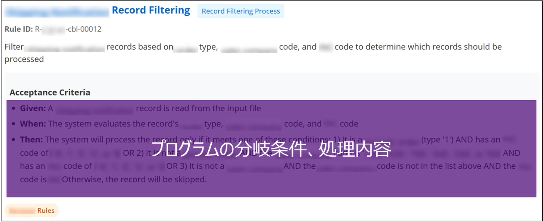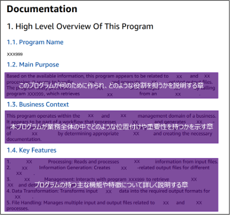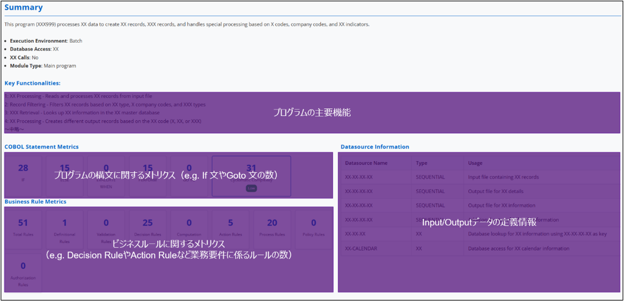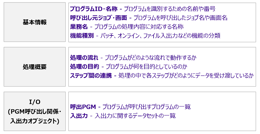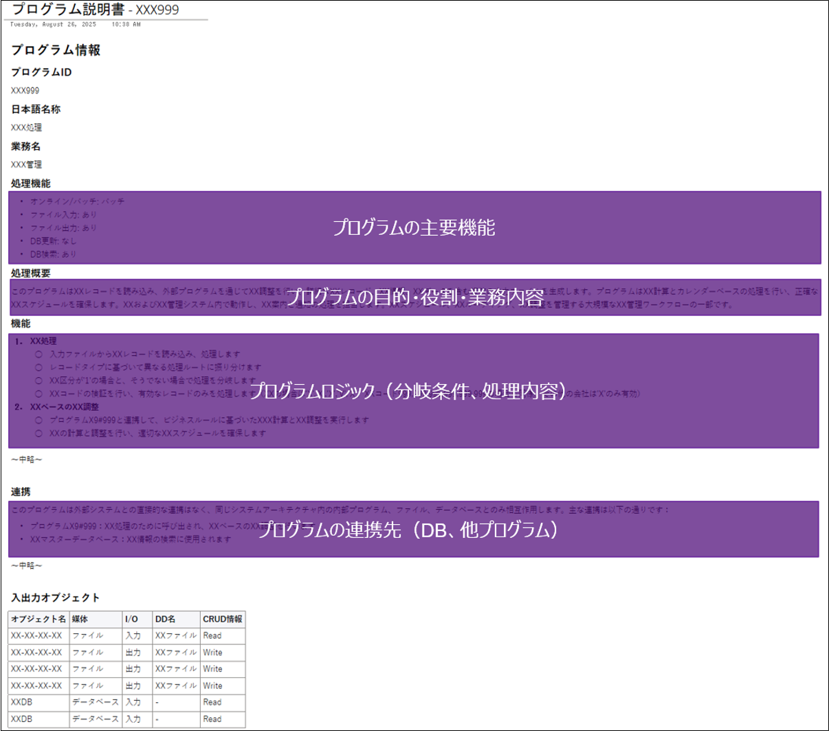 生成されたドキュメントからはプログラムの業務上の目的や役割を把握するために必要な情報を読み取ることが出来ます。また、入出力データの業務要件、他プログラムとの依存関係、エラーハンドリングといった情報が整理され、影響調査や業務観点でテストケースを洗い出すようなユースケースにおいて活用できます。