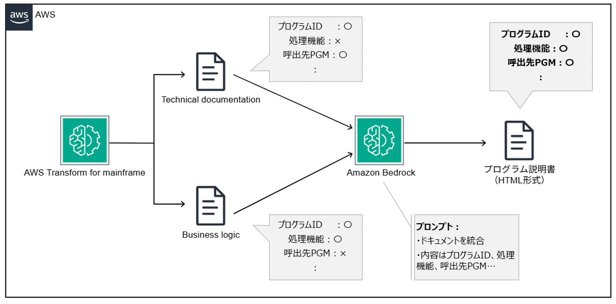Technical Documentation は全体の業務要件理解に役立ち、Business Logic はプログラム内のビジネスルールや詳細ロジックの抽出に特化しています。プログラム説明書では、全体の要件の記載、詳細な分岐条件やロジックの記載が求められていた為、AWS Transform for mainframe から出力される Technical Documentation と Business Logic の内容を組み合わせるアプローチを採用しました。両方の要素を、Amazon Bedrock (モデル: Anthropic Claude 3.7 Sonnet) を活用し、必要な情報を抽出して再構成しました。また、2025 年 10 月時点での AWS Transform for mainframe の言語対応状況を踏まえ、日本語への翻訳も実施しています。