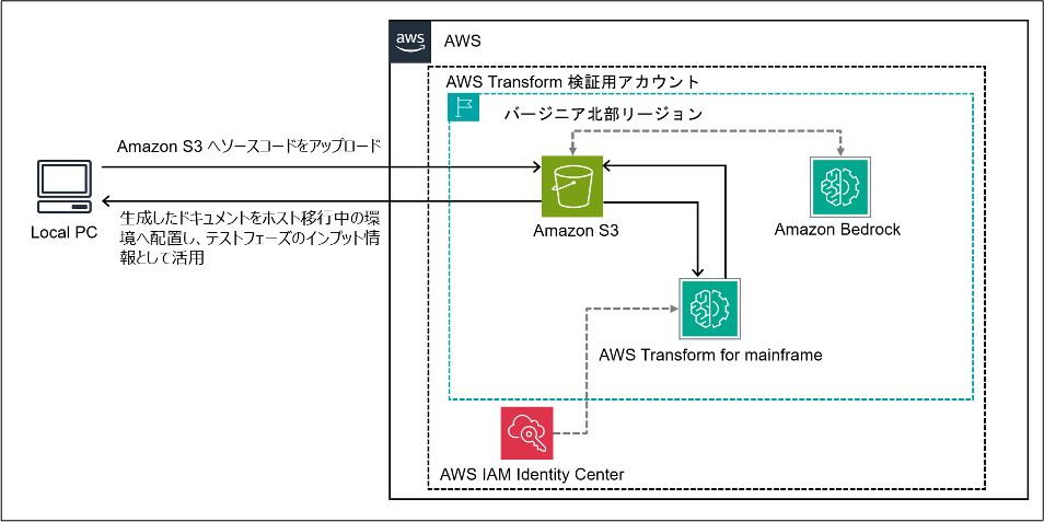 対象のソースコードを Amazon S3 へ配置し、AWS Transform for mainframe のコード分析とドキュメント生成 (Generate Technical Documentation 及び Extract Business Logic) を検証します。なお、2025 年 10 月時点では AWS Transform for mainframe は東京リージョンが利用できない為、バージニア北部リージョンを利用しています。