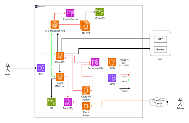 新アーキテクチャではバックエンド API を一本化して、開発言語も Python から C# へと変更しました。この C# で構築されたバックエンド上では、TTS や STT 以外の、RAG や感情分析を行う各種モデルが動いています。TTS や STT については、従来通り Python ベースのシステムとして運用しています。