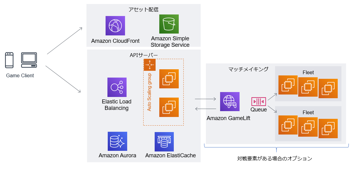 こちらの例でご紹介する構成の場合、ゲームのためのアセット配信には、データの格納領域として Amazon S3 を利用し、コンテンツ配信ネットワークである Amazon CloudFront を組み合わせることでピーク時におけるオリジンサーバ(Amazon S3)の負荷を気にすること無く安定的なアセット配信が実現できます。ゲームプレーについては、API サーバーを Elastic Load Balancing で負荷分散した Amazon EC2 の Auto Scaling Group で構成し、データベースとして Amazon Aurora、データベースのキャッシュストアとして ElastiCache を組み合わせて、高い可用性と優れた性能を実現します。