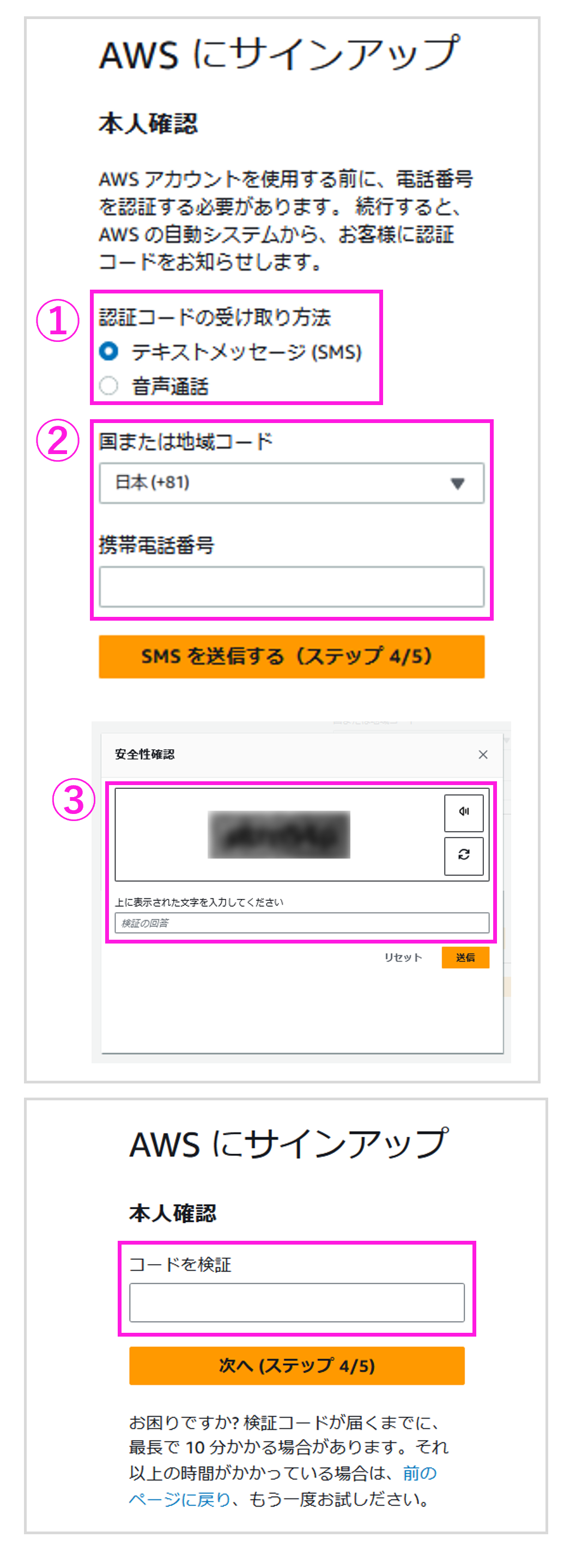 作成していただいた AWS アカウントのご本人確認を行います。テキストメッセージ (SMS) または、電話(自動音声) をお選びいただけます。