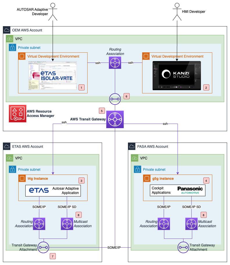 이 아키텍처는 OEM이 vEDT와 AWS 서비스를 활용해 자사 개발자와 두 개의 공급업체 — 이번 사례에서는 ETAS와 Panasonic Automotive(PASA) — 간의 보다 원활한 협업을 가능하게 할 수 있는 잠재력을 보여줍니다. 이는 그림 1의 아키텍처에 표시된 세 개의 AWS 계정으로 반영되어 있습니다.