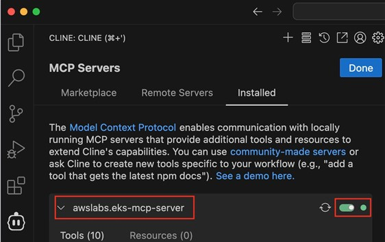 설치가 성공적으로 완료되면, 다음 그림과 같이 Cline에 설치된 MCP 서버 목록에서 EKS MCP 서버를 확인할 수 있습니다.