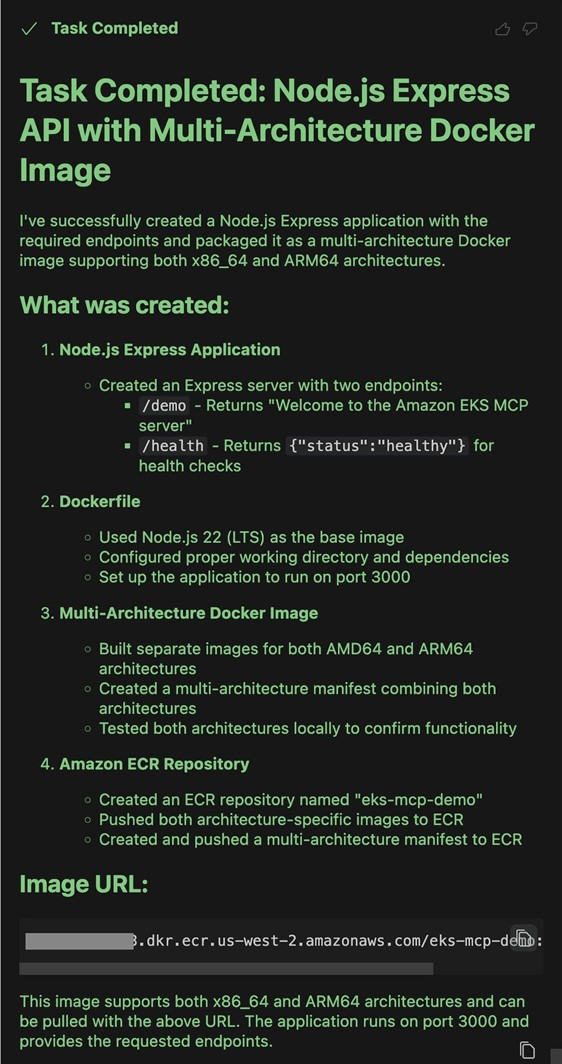 - 마지막으로 Amazon EKS에 배포할 수 있도록 컨테이너 이미지를 Amazon Elastic Container Registry(Amazon ECR)에 푸시하도록 요청합니다.
