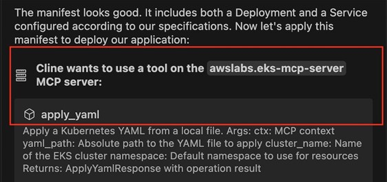 그림 6: YAML 매니페스트 적용을 위해 EKS MCP 도구를 호출하는 Cline