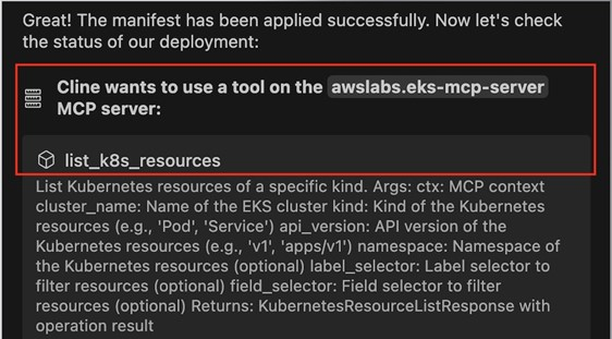 그림 7: Cline이 쿠버네티스 리소스를 나열하기 위해 EKS MCP 도구를 호출하는 모습