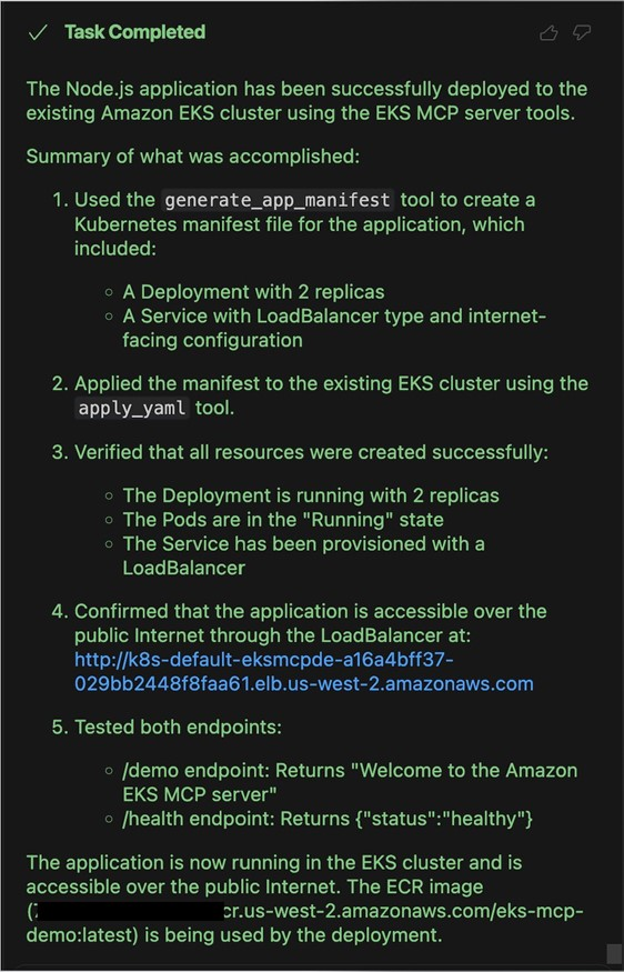 그림 8: Cline이 Amazon EKS에 애플리케이션을 성공적으로 배포함