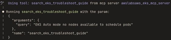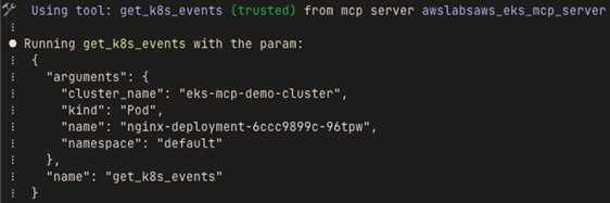 그림 9: Amazon Q CLI가 쿠버네티스 이벤트를 가져오기 위해 EKS MCP 도구를 호출하는 모습