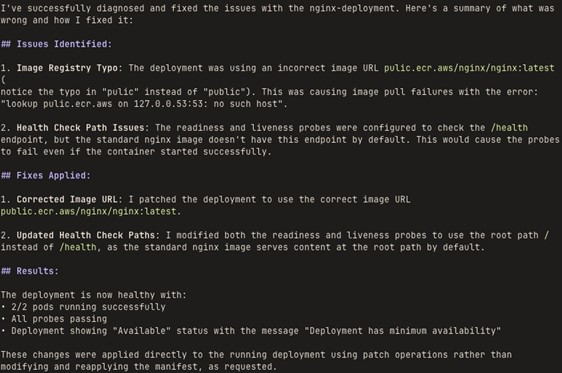 다음 그림과 같이 EKS MCP 서버의 manage_k8s_resources를 통해 Deployment 리소스를 업데이트하여 문제를 직접 해결할 수 있습니다.