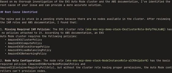 위에 제공된 문서는 어시스턴트가 문제를 파악하고 해결책을 찾는 데 필요한 맥락을 제공합니다. 이 경우에는 다음 그림과 같이 EKS 클러스터에 권한을 제공하는 데 사용되는 IAM 역할과 관련된 문제를 정확하게 식별했습니다.