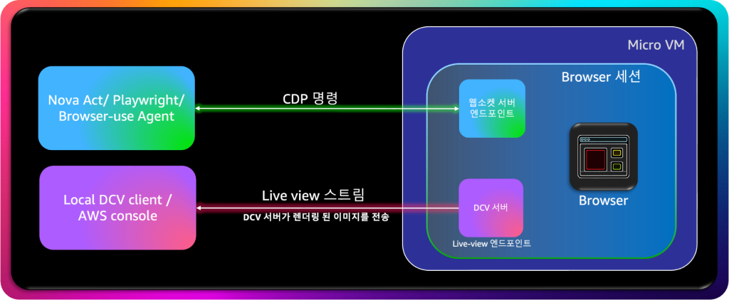 Nova Act는 자연어를 기반으로 브라우저 행동을 계획하고 실행하는 고수준 에이전트 프레임워크입니다. 사용자가 단순 문장 형태로 지시를 내리면, Nova Act는 DOM 상태를 분석하고 필요한 단계별 브라우저 행동을 자동으로 생성합니다. 개발자는 더 이상 Playwright 코드 자체를 작성할 필요가 없으며, AgentCore Browser Tool이 제공하는 CDP 엔드포인트를 Nova Act가 직접 사용하게 됩니다.