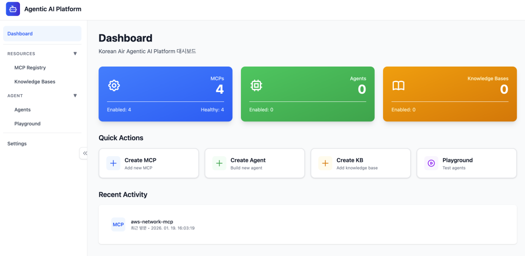 Agentic AI 기반 플랫폼은 MCP(Model Context Protocol), Amazon Bedrock Knowledge Base(지식 기반), AI Agent를 생성, 등록, 테스트, 배포할 수 있는 플랫폼입니다. 사용자들은 필요한 도구(MCP, Knowledge Base)를 미리 만들어 이들을 Agent에 연결하고 적절한 프롬프트를 줌으로써 동작을 확인하고 이후 배포할 수 있습니다.