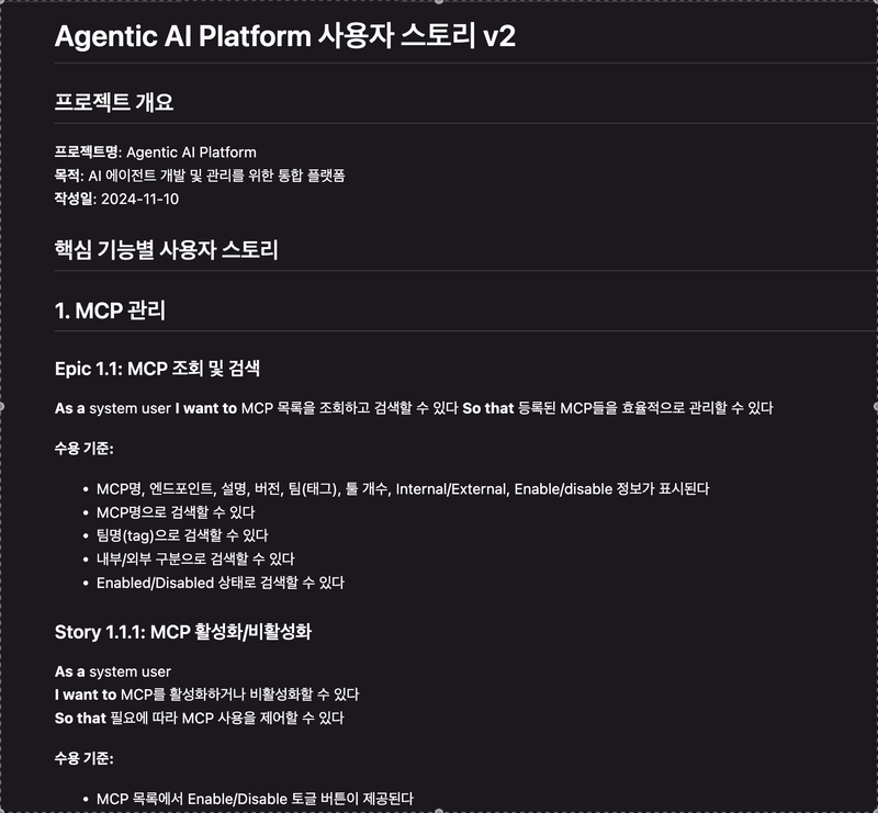 아래는 실제 AI-DLC를 통해 생성된 문서의 일부입니다. (사용자 스토리, 코드생성을 위한 NFR 요구사항)