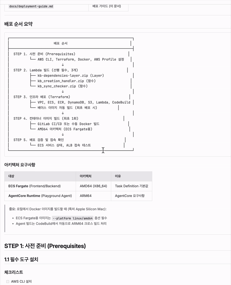 배포 가이드 문서는 아래와 같습니다. 배포에 필요한 정보와 순서에 대해 명확히 작성하여, Agent의 resources 속성을 통해 context로 제공합니다.