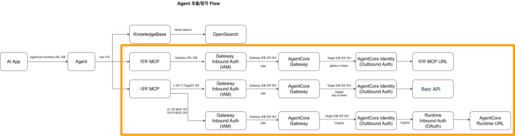 - Internal MCP (Container) : 컨테이너 기반의 Custom MCP를 Amazon Bedrock AgentCore Runtime에 배포 및 AgentCore Gateway로 MCP화
