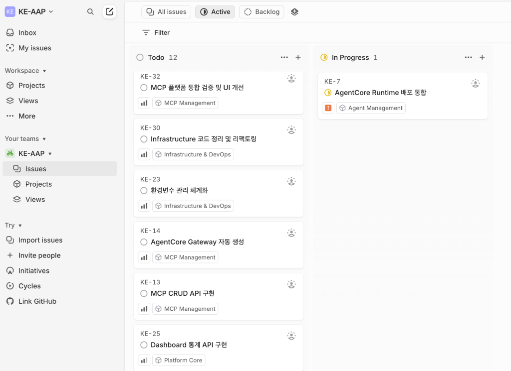AgentCore 및 Strands Agents 관련 개발 AWS 리소스 확인 Linear 연동하여 이슈 관리 |