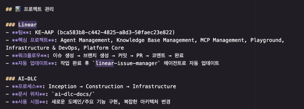 - Linear : 이슈 추적과 기술 결정을 기록했습니다. AI Agent들이 자동으로 생성/업데이트하도록 Claude Code 의 CLAUDE.md, Kiro의 Steering을 설정한 후 각 AI Coding Assistant에 Linear MCP를 등록하였습니다. 이를 통해 진행해야하거나 진행 중인 업무를 확인하고, 특정 이슈에 대해 결정했던 수정 방향에 대한 히스토리를 남기는 등, 프로젝트 메타 문서(README.md, AGENTS.md, docs/)에는 남길 수 없었던 다양한 기술 논의 사항에 대해 기록했습니다.