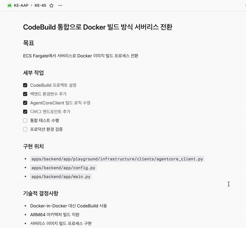 이러한 과정을 통해, AI의 결정에 대해 한번 더 들여다 볼 수 있는 근거가 생기고, 중요한 결정에는 사람이 반드시 피드백을 주며, 또한 모든 결정은 문서화하는 환경을 구성했습니다. 이러한 문서/Issue들은 자연스레 Context 되어 Kiro 와 Claude Code로 개발하는 시점에 적절히 활용될 수 있습니다.