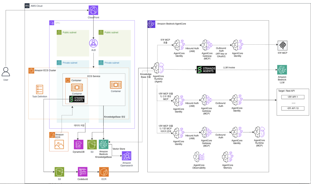 전체 시스템은 다음과 같은 아키텍처로 구성되어 있습니다. 플랫폼의 웹을 위한 백엔드/프론트엔드는 ECS에서 운영되며, 플랫폼을 통해 실제 배포되는 MCP/Agent들은 모두 AgentCore의 Runtime에 배포됩니다. 또한 MCP는 AgentCore Gateway 를 통해 통합 관리하며 AgentCore Identity를 통해 접근 권한을 제어합니다. Agent 역시 AgentCore Identity를 통해 접근 제어를 하였으며, 본 프로젝트에서는 IAM과 Cognito를 통한 접근 권한 관리를 주로 활용하였습니다.