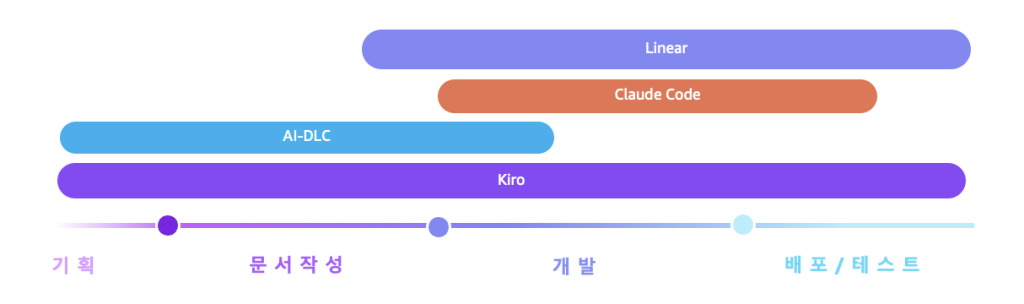 - Kiro : Custom agent를 생성할 수 있는 것이 큰 장점입니다. Kiro를 사용하는 다른 동료들과 공통의 Custom agent 설정 및 저장하여 비교적 일관된 AI Agent를 통해 업무를 지시할 수 있습니다. 이 프로젝트에서는 AI-DLC Agent, 개발 Agent, 문서 조회 Agent, 사내 툴 연동 Agent, Devops Agent, 배포 Agent 등을 만들어 함께 사용했습니다. 또한 Kiro는 use_aws 툴을 제공함과 더불어, MCP 서버들(AWS 공식 MCP 및 Terraform MCP, Linear MCP 등)과 연동하여 AWS 인프라 작업에 특화된 강점을 보입니다.