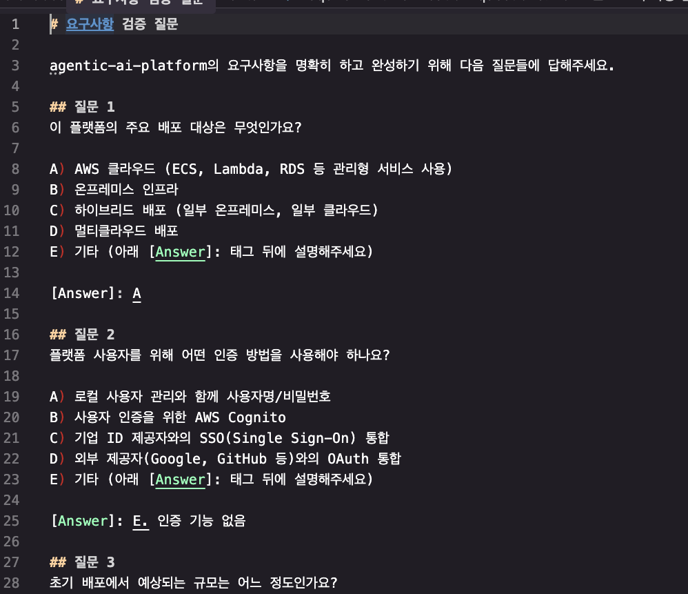 흥미로운 점은, AI-DLC가 문서 작성 과정에서 불명확한 요소에 대해 단순히 추론하고 대신 결정하지 않는다는 점입니다. 대신 [Question]/[Answer] 패턴을 통해 사람이 직접 결정하고 답하도록 구성하며 Human in the loop을 지향합니다.