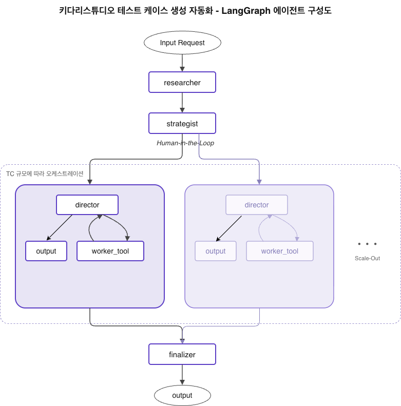 키다리스튜디오는 TC 생성 과정을 전문화된 에이전트들의 협업 구조로 재설계 했습니다: