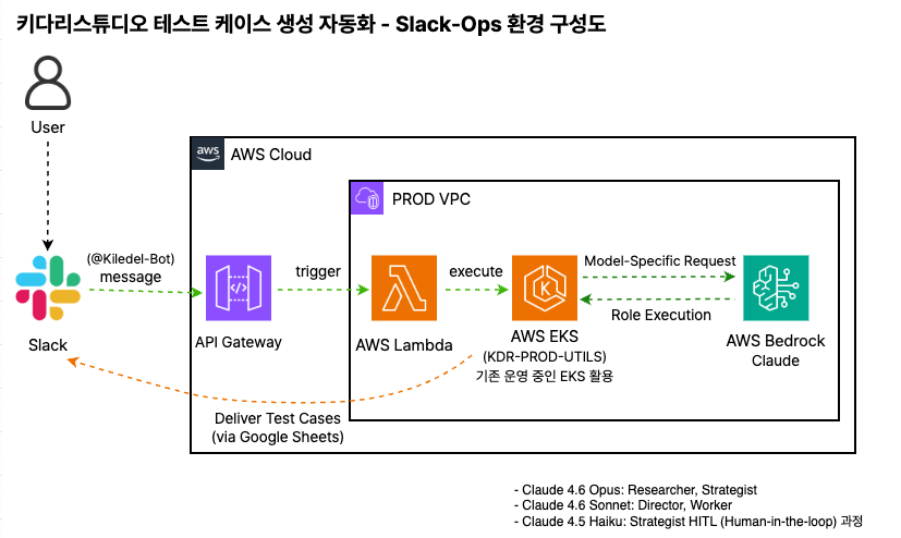 키다리스튜디오 플랫폼개선팀은 이 문제를 해결하기 위해 Amazon Bedrock의 Claude 모델과 LangGraph 기반 멀티 에이전트 아키텍처를 활용한 테스트 케이스 생성 자동화(Test Case Auto-Creator)를 개발했습니다. 이 시스템은 기획서 URL이나 이미지를 입력받아 QA팀이 즉시 활용할 수 있는 테스트 케이스를 2~5분 만에 자동 생성하며, 초안 커버리지 70~80%를 달성하고 있습니다.