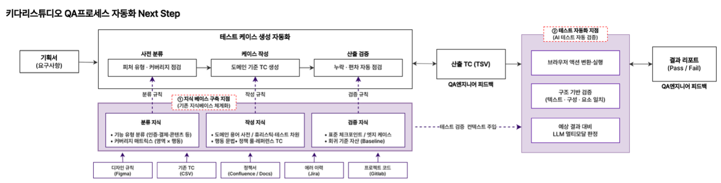 웹툰/웹소설 플랫폼을 운영하는 키다리스튜디오는 레진코믹스, 봄툰 등 다수의 콘텐츠 플랫폼을 서비스하고 있습니다. 플랫폼의 품질을 보장하기 위해 QA 엔지니어링팀은 매 릴리스마다 수백 개의 테스트 케이스(TC)를 수동으로 작성해왔습니다. 숙련된 QA 엔지니어 한 명이 하나의 페이지에 대한 TC를 작성하는 데 3~4시간이 소요되었고, 이는 빠른 릴리스 주기에 큰 병목이 되고 있었습니다.