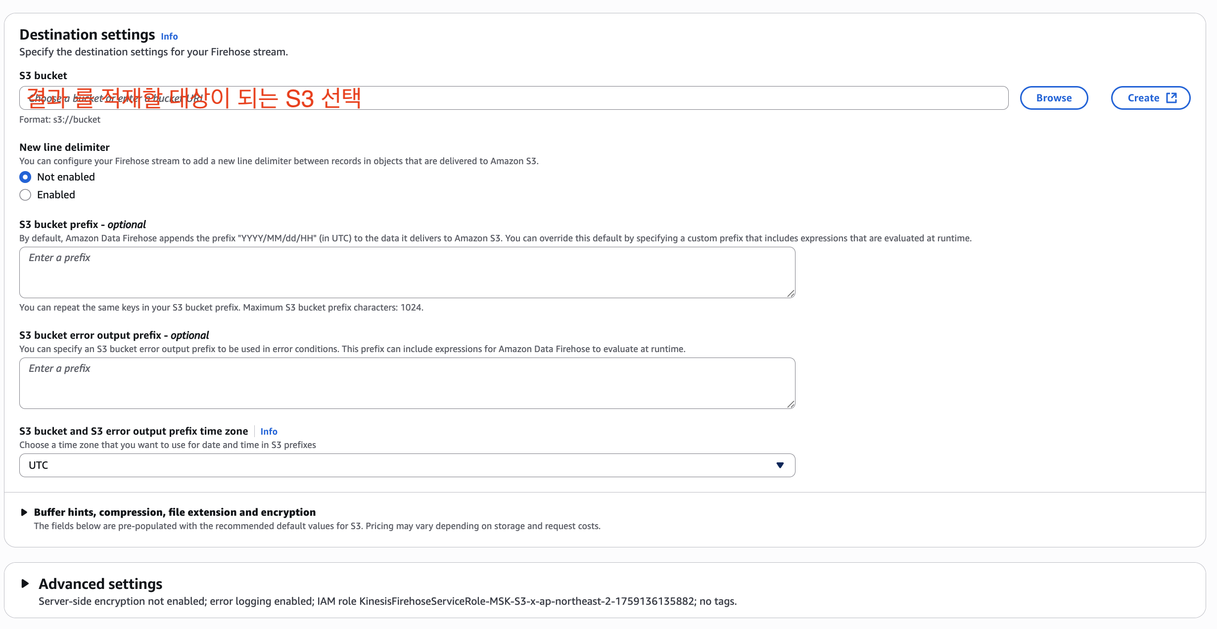 Amazon Data Firehose는 AWS에서 제공하는 완전 관리형 스트리밍 데이터 전송 서비스로, MSK에 저장된 MSF 처리 결과를 자동으로 수집하여 Amazon S3로 안정적으로 전송하는 역할을 수행합니다. 뉴스 기반 주식 분석 시스템에서 Firehose는 분석 결과가 담겨있는 MSK의 토픽을 실시간으로 읽어서 S3 버킷에 배치 형태로 저장하는 역할을 수행합니다.