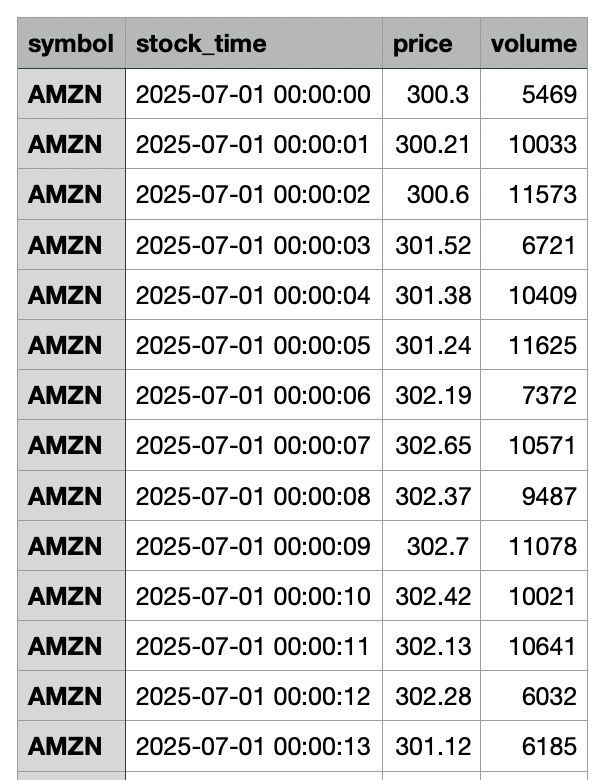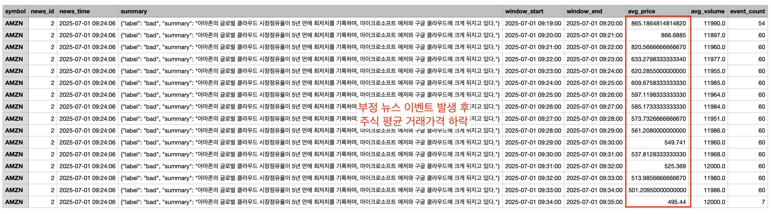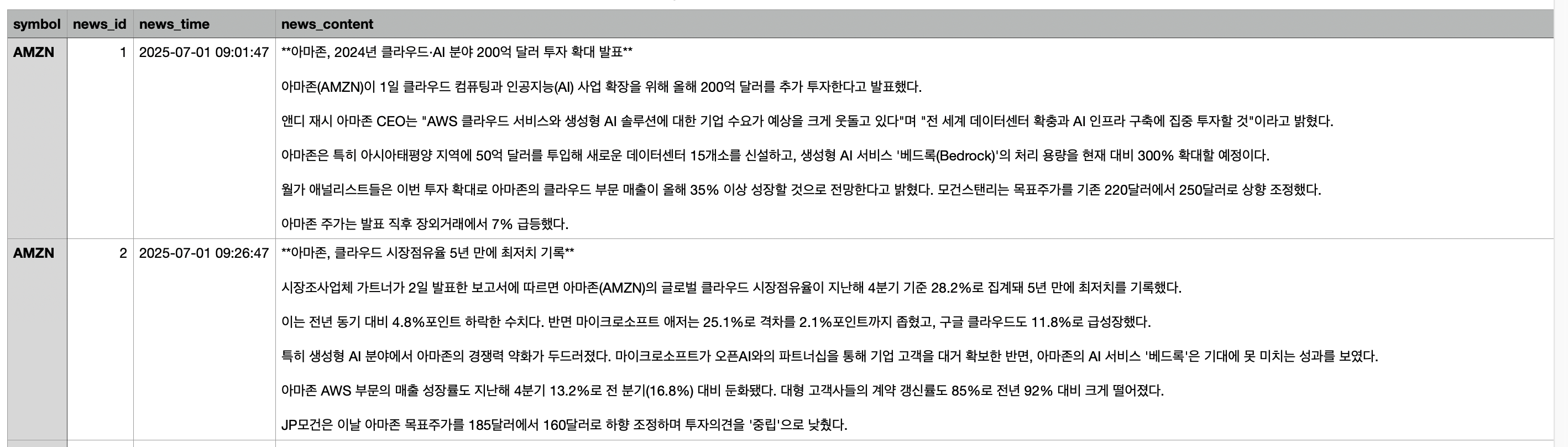 뉴스 데이터 스트림은 symbol, news_id, news_time, news_content 필드로 구성되어 있으며, 불규칙적으로 발생하는 저빈도 이벤트 특성을 보입니다. (예시: 데이터에서 아마존(AMZN)의 뉴스는 2025년 7월 1일 오전 9시 1분 47초에 발생한 단일 이벤트로, 200억 달러 클라우드·AI 투자 확대라는 뉴스 내용을 포함하고 있습니다. 이러한 뉴스는 하루에 몇 건 정도만 발생하지만 주식 가격에 즉각적이고 큰 영향을 미칠 수 있습니다.)