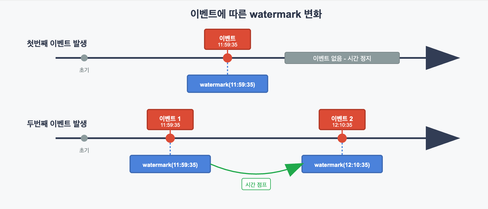 하지만 Flink의 watermark는 실제로 아무런 이벤트가 없을 경우 진행되지 않고 이전 값에서 정지 상태를 유지합니다. 대신 이벤트가 들어올 때 그 이벤트 시간만큼 시간을 움직입니다. 예를 들어, 사용자가 11:59:35에 음식을 결제한다고 가정해 봅시다. 이 이벤트가 Flink의 처리 파이프라인에 도달하는 순간, watermark라는 메타 레코드가 스트림에 삽입되어 “현재 시간이 11:59:35까지 진행되었다”는 신호를 보냅니다. 이후 다른 사용자가 12:10:35에 결제하여 두 번째 이벤트가 생성됩니다. 이 두 번째 이벤트가 Flink의 스트림에 유입될 때, 새로운 watermark 메타 레코드가 생성되어 “현재 시간이 11:59:35에서 12:10:35로 진행되었다”라는 신호를 보냅니다. 그리고 watermark는 신호안에 두 가지 중요한 의미를 담고 있습니다. 첫 번째는 “현재 12:10:35까지 시간이 진행되었으니, 12:10:35 이전 데이터로 수행 가능한 모든 분석을 진행해“라는 처리 진행 신호이며, 두 번째는 “12:10:35 이후로는 그보다 이른 시간의 늦은 데이터(late data)를 더 이상 받지 않겠습니다”라는 지연 데이터 차단 메시지입니다.