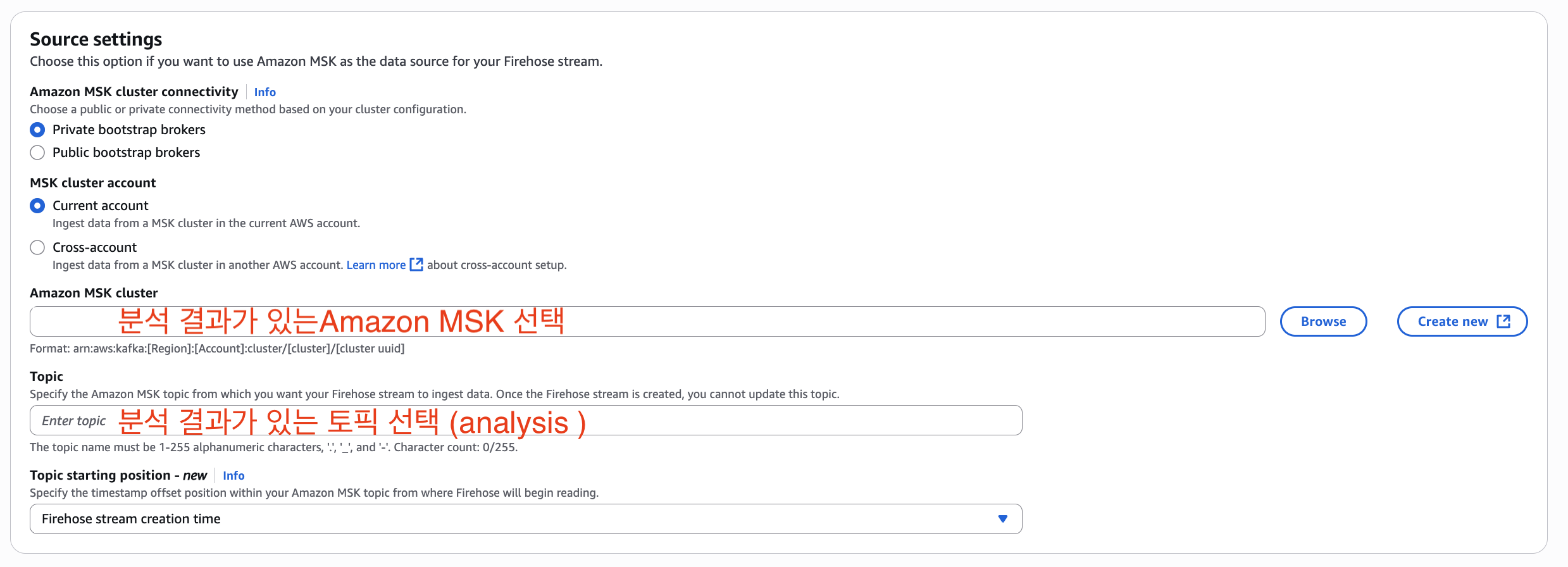 Amazon Data Firehose는 MSK에서 생성되는 대용량 스트리밍 데이터를 Amazon S3로 자동 적재하는 서비스입니다. 이 서비스의 핵심은 편리성입니다. 단순히 MSK 토픽을 소스로 지정하고 S3 버킷을 대상으로 설정하는 것만으로 별도의 코드 작성이나 인프라 관리 없이 자동으로 데이터 전송이 시작할수 있습니다. 현재 Interval Join을 마친 분석 데이터가 MSK topic(analysis)에 적재되어 있는 상황입니다. Amazon Data Firehose를 통해 MSK에서 S3로 복잡한 구성 없이 적재 하는 파이프라인을 만들어 보도록 하겠습니다.
