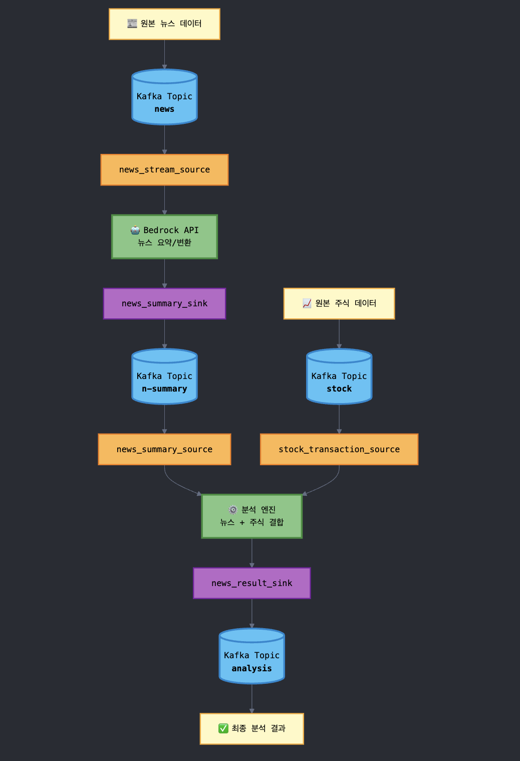 실제 구현에서 MSF는 MSK를 source와 sink로 활용하여 완전한 스트림 처리 파이프라인을 구성합니다. Kafka 토픽으로부터 데이터를 Flink로 읽어 오는 것을 Source라고 합니다. MSF는 이 데이터를 실시간으로 처리하여 뉴스 감정 분석, 주가 변동 계산 등의 복잡한 연산을 수행한 후, 처리된 결과를 다시 MSK의 다른 토픽으로 전송하는데 이를 Sink라고 합니다. 이러한 구조를 통해 데이터의 흐름이 끊어지지 않고 연속적으로 처리되며, 각 컴포넌트 간의 느슨한 결합을 통해 시스템의 유연성과 확장성을 극대화할 수 있습니다.