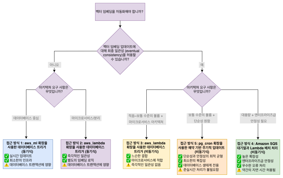 - 데이터베이스 트리거와 aws_ml 확장을 사용한 직접 동기 호출은 트랜잭션 중 성능 저하를 감수하는 대신 단순성과 즉각적인 일관성을 제공합니다.