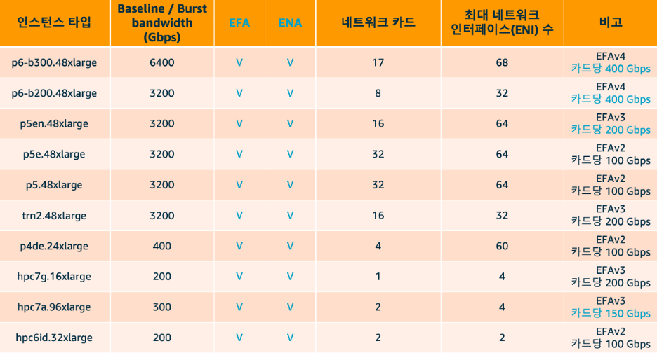 Nitro 기반 인스턴스를 기준으로, 개별 ENI는 ENA(Elastic Network Adapter) 또는 EFA(Elastic Fabric Adapter, ENA의 확장) 속성 중 하나를 가집니다. 분산 트레이닝을 수행하거나 고성능의 엔지니어링 시뮬레이션이 필요하다면 EFA 사용은 필수입니다.