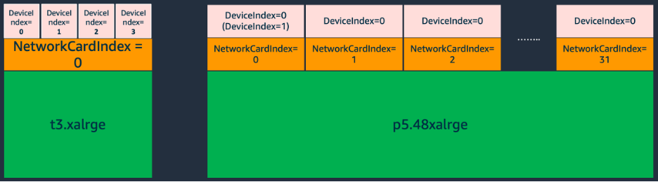 고성능 컴퓨팅을 위한 인스턴스는 여러 개의 네트워크 카드를 보유하며, 각 카드에 여러 개의 ENI를 연결할 수 있습니다. 이 경우 DeviceIndex의 동작 방식이 일반 인스턴스와 크게 달라집니다.