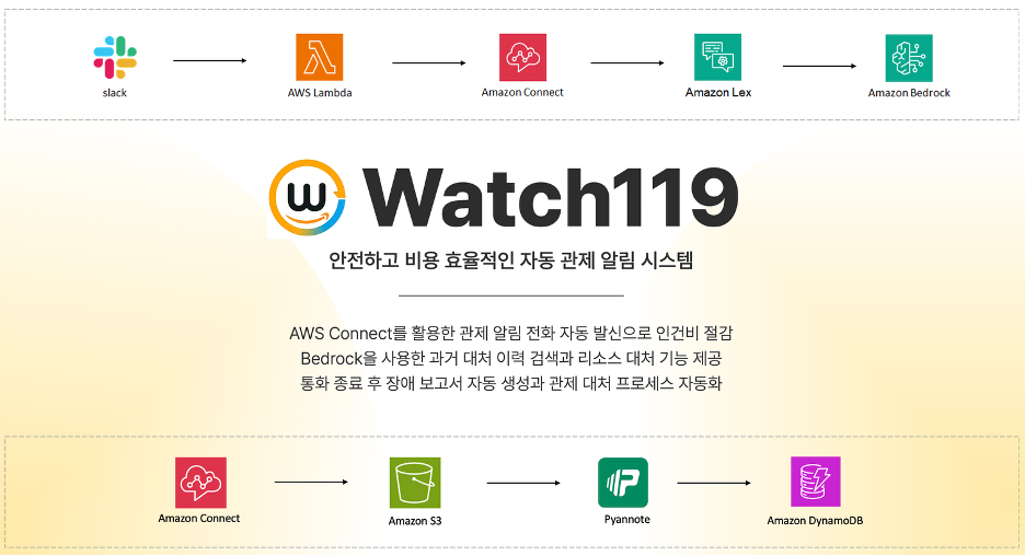 기존 관제는 사람의 모니터링에 의존해 관제 알림이 발생하면 사람이 직접 전화를 발신하는 방식이었는데, 이벤트 정보 수집을 통해 Amazon Connect를 통해 담당자에게 음성 발신을 자동화를 제공한다.