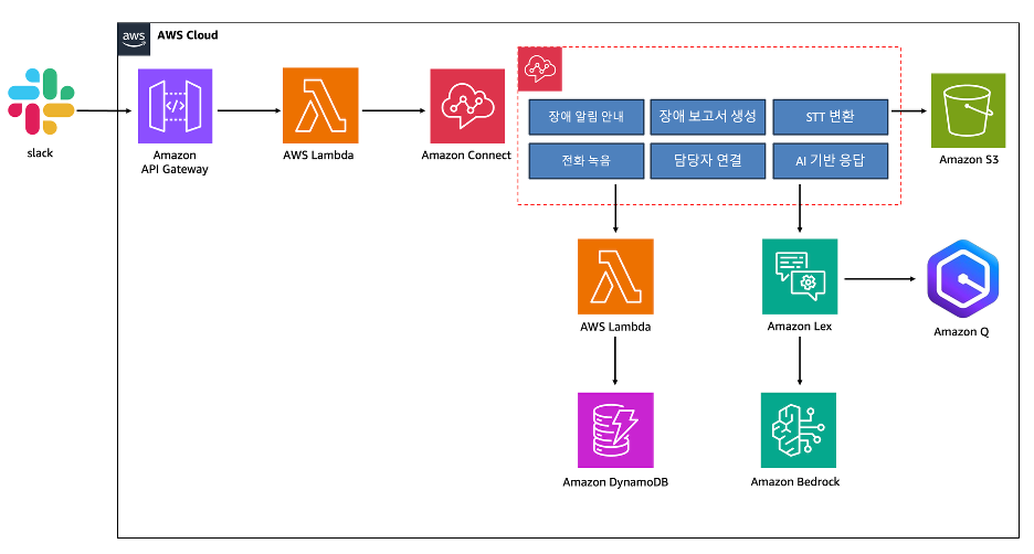 - AI 기반 응답 제공: Amazon Lex가 자연어 질의를 처리하고, Amazon Q와 Amazon Bedrock을 활용하여 통화 내용을 분석하고, 장애 대응 가이드를 제공