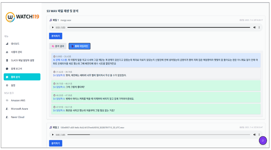 이전에는 담당자가 장애 보고서에 알림 메시지와 대응 방법을 작성해서 보고했었으나, Watch 119에서는 이를 자동화하여 전화 종료 즉시 전화 내용을 텍스트화하여 장애 보고서를 자동 생성합니다.
