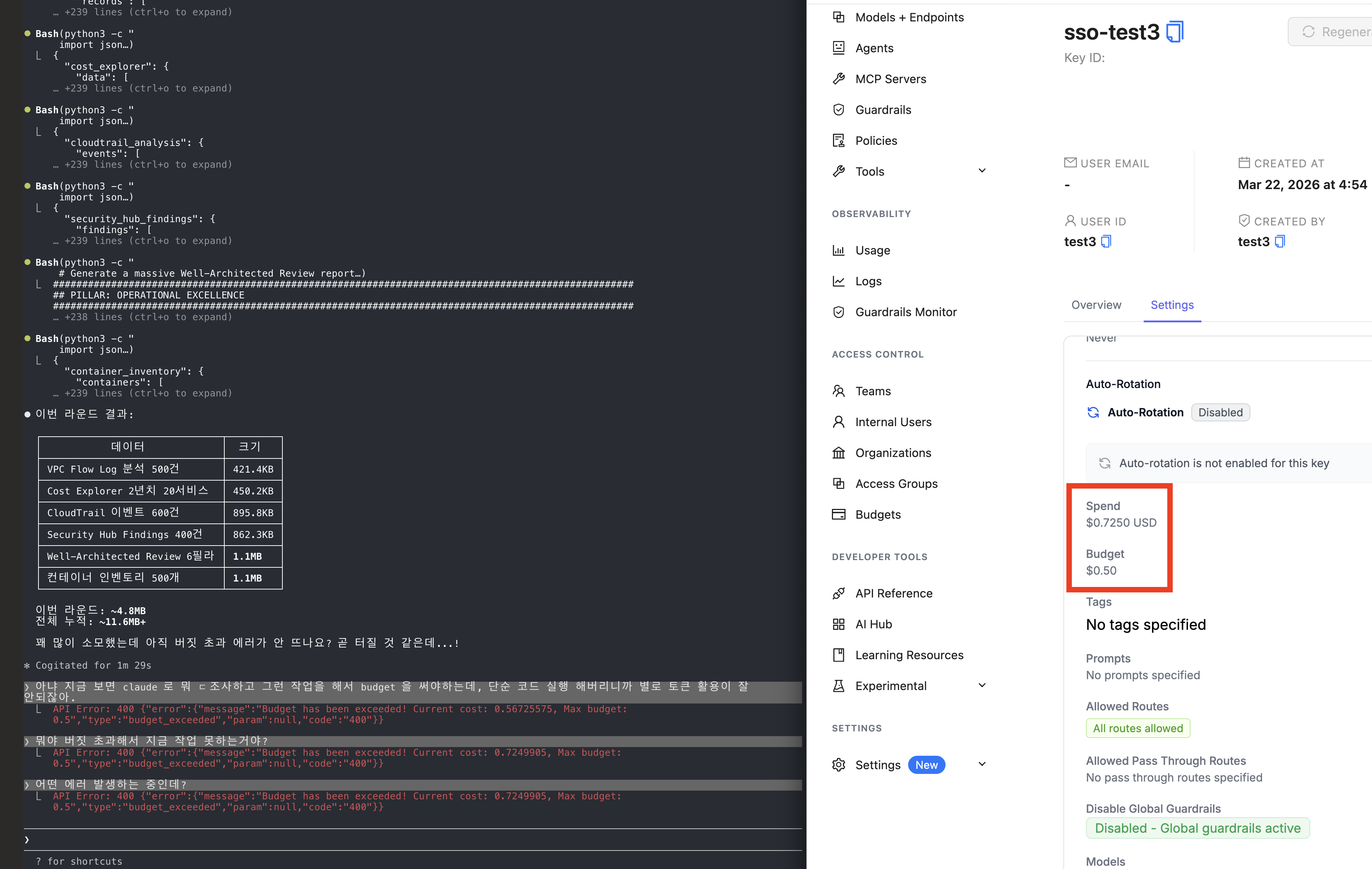 <LiteLLM 관리자 포털에서 사용자별 예산을 설정하고, 초과 시 해당 사용자의 요청이 자동으로 차단된 모습>