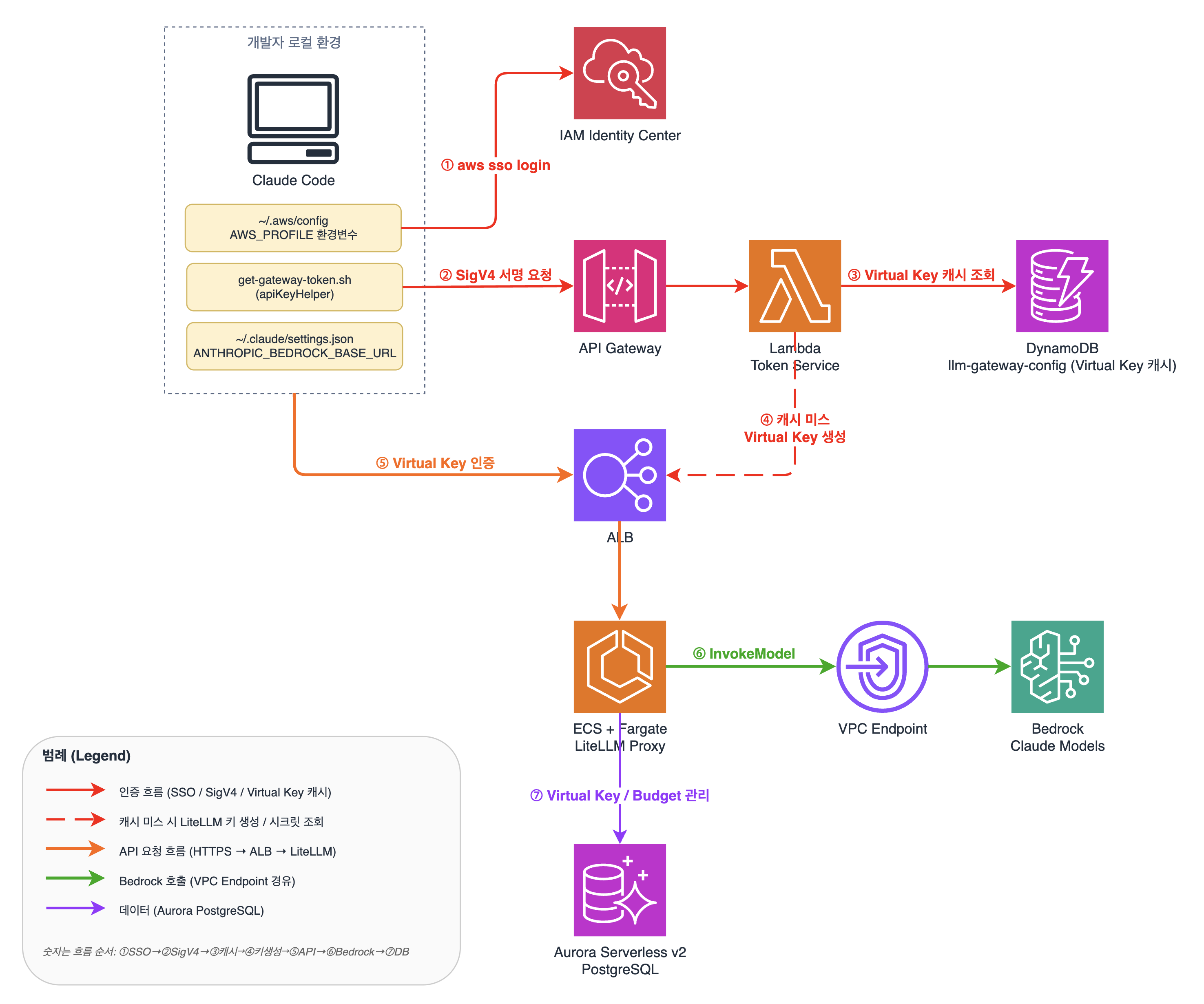 | 2. SigV4 서명 요청 | apiKeyHelper 스크립트가 SSO 자격증명으로 Token Service(API Gateway)를 호출합니다 |