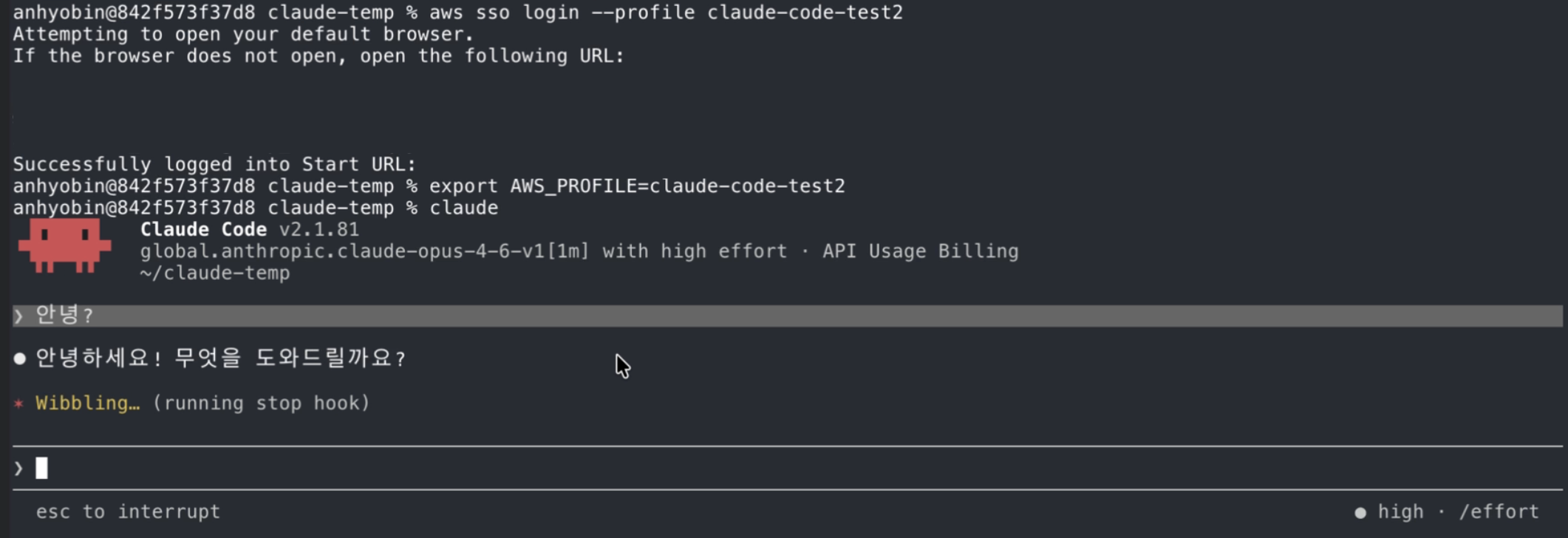 aws sso login과claude실행만으로 모든 인증과 키 관리 과정을 의식하지 않고 Claude Code를 사용할 수 있습니다.