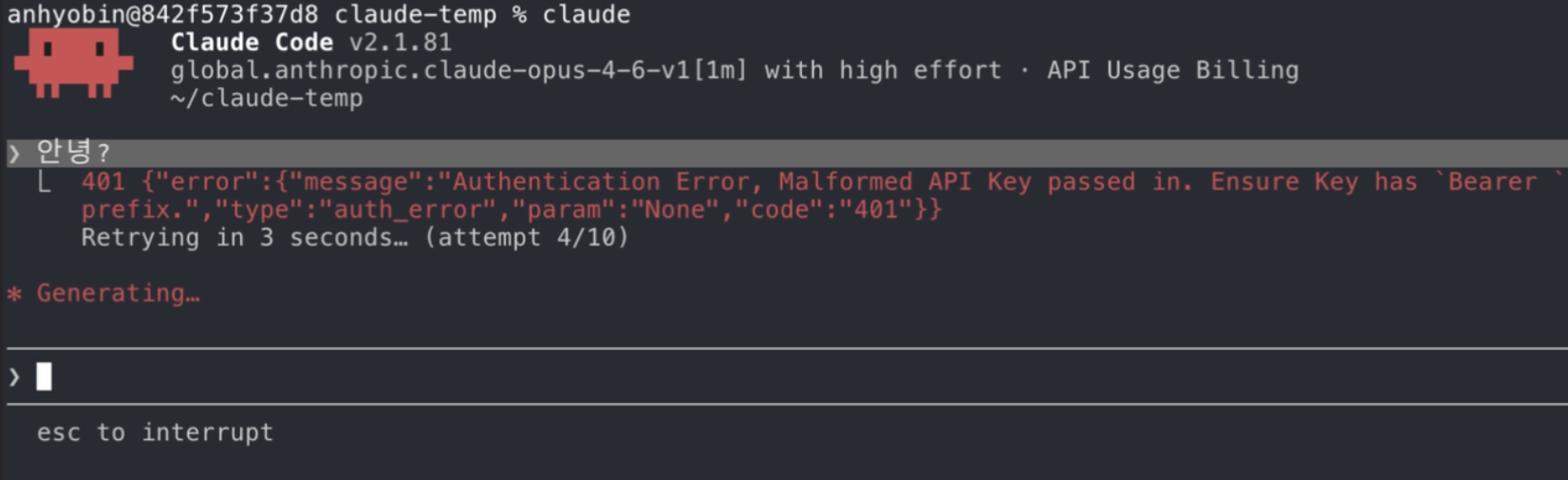 SSO 로그인 없이 Claude Code를 실행하면, apiKeyHelper 스크립트가 SSO 자격증명을 찾지 못해 오류를 반환합니다: